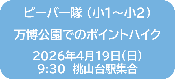2026年3月22日 / 最終更新日 : 2026年3月28日 toyonaka18_admin お知らせ 2026年度 入団・体験者大募集! ボーイスカウト豊中第18団では2026年度も入団希望者を大募集しています! 泉丘小学校を中心に活動しており、 ビーバー隊(小1~小2)、カブ隊(小3~小5)、ボーイ隊(小6~中3) とも、いつでも体験参加を受け付けていま […]